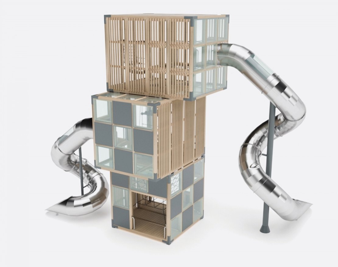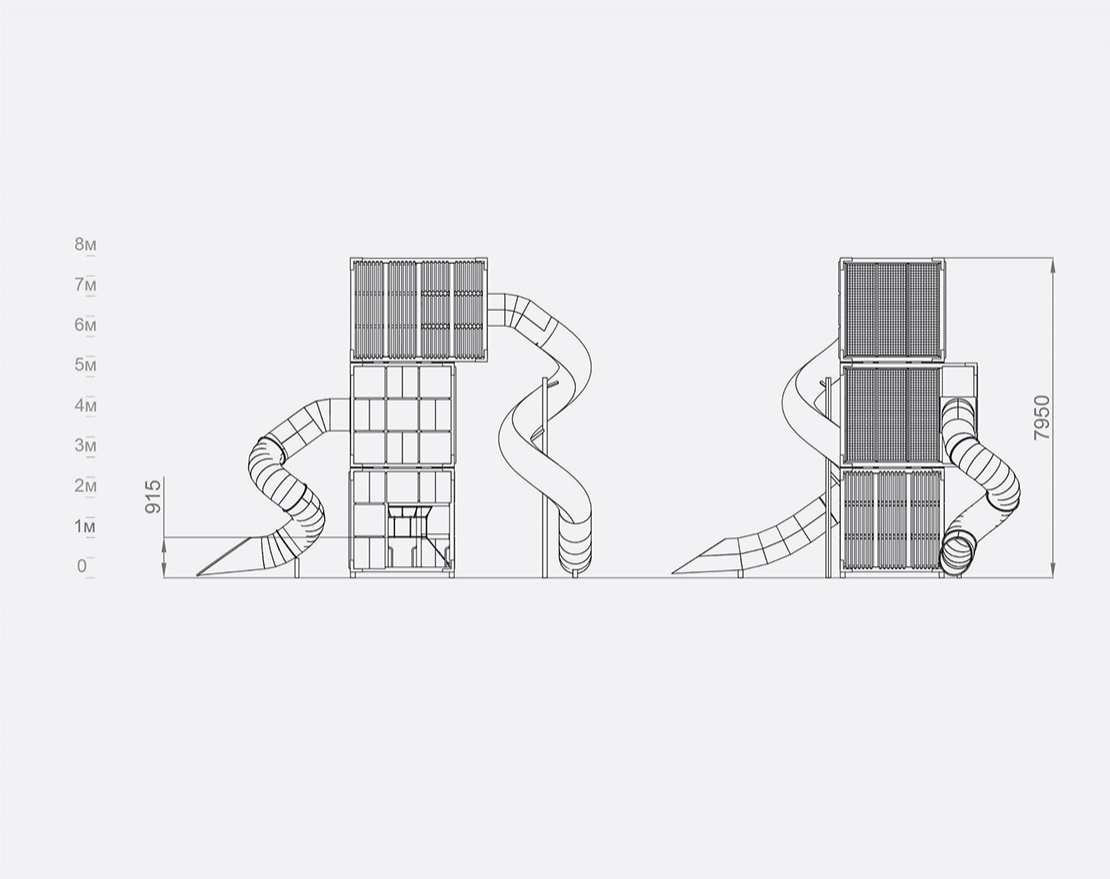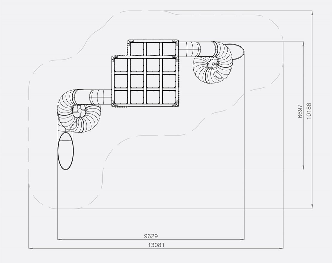 Представляет собой комплекс, состоящий из 3-х секций. Первая секция оснащена канатными стропами с пластиковыми ручками. Вторая — металлическими поручнями и канатом. А на третьей секции расположены уступы и качель-гнездо. Конструкция оснащена также металлическими тоннельными горками.