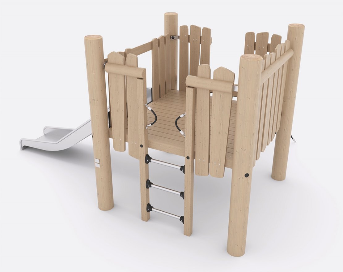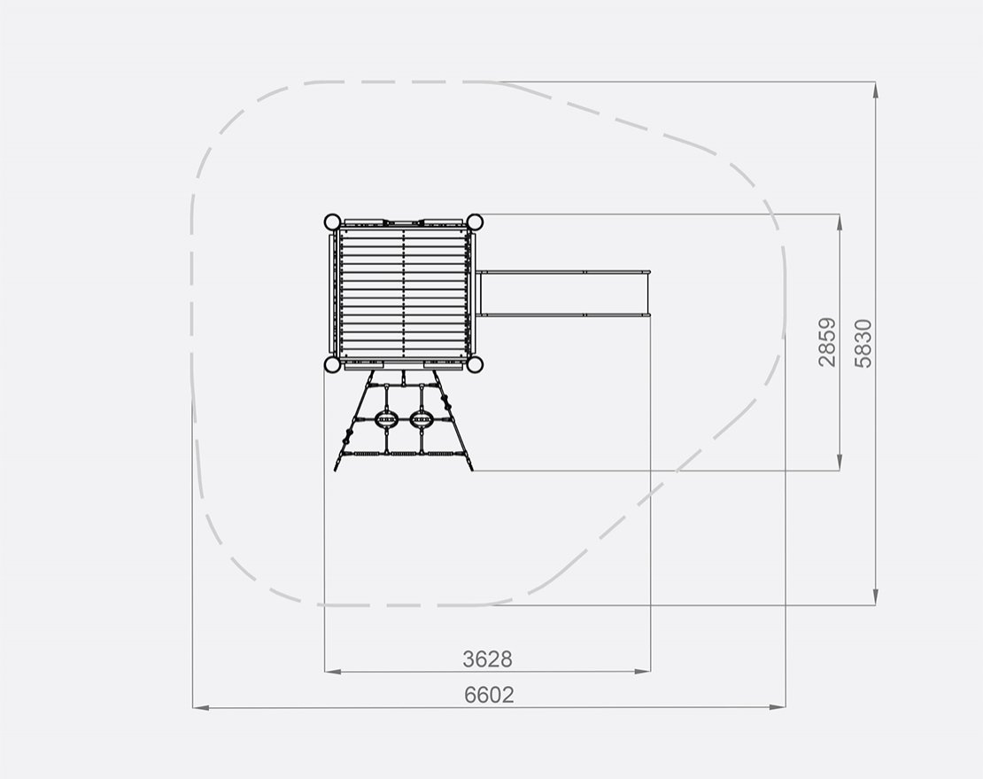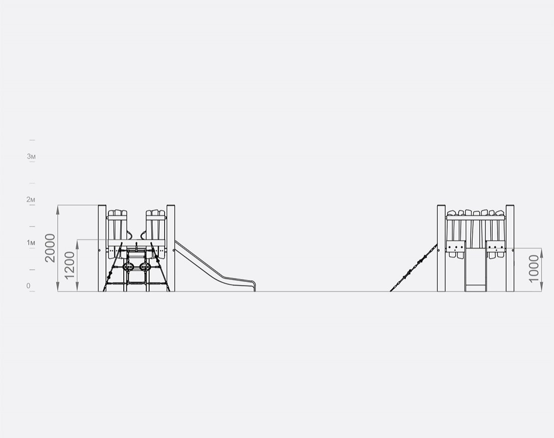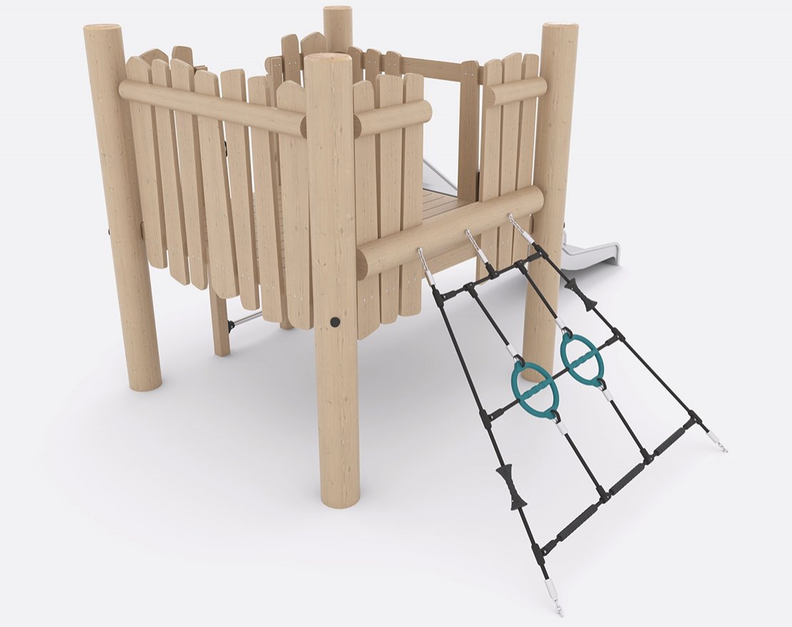 Состоит из опорных стоек, канатной сетки и металлической открытой горки с защитными бортиками. Для большего комфорта, конструкция оснащена ручками-стропами, а канатная сетка — пластиковыми уступами.
